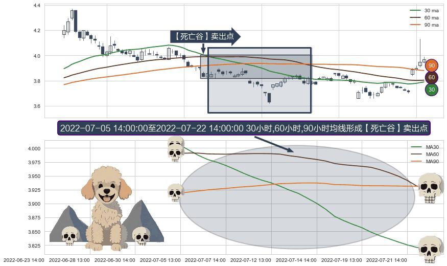 ⚀ 2022-07-06 13:00:00-小时至2022-07-22 14:00:00-小时显现 30小时-60小时-90小时均线 【死亡谷】卖出点 看空信号,后市看跌,卖出