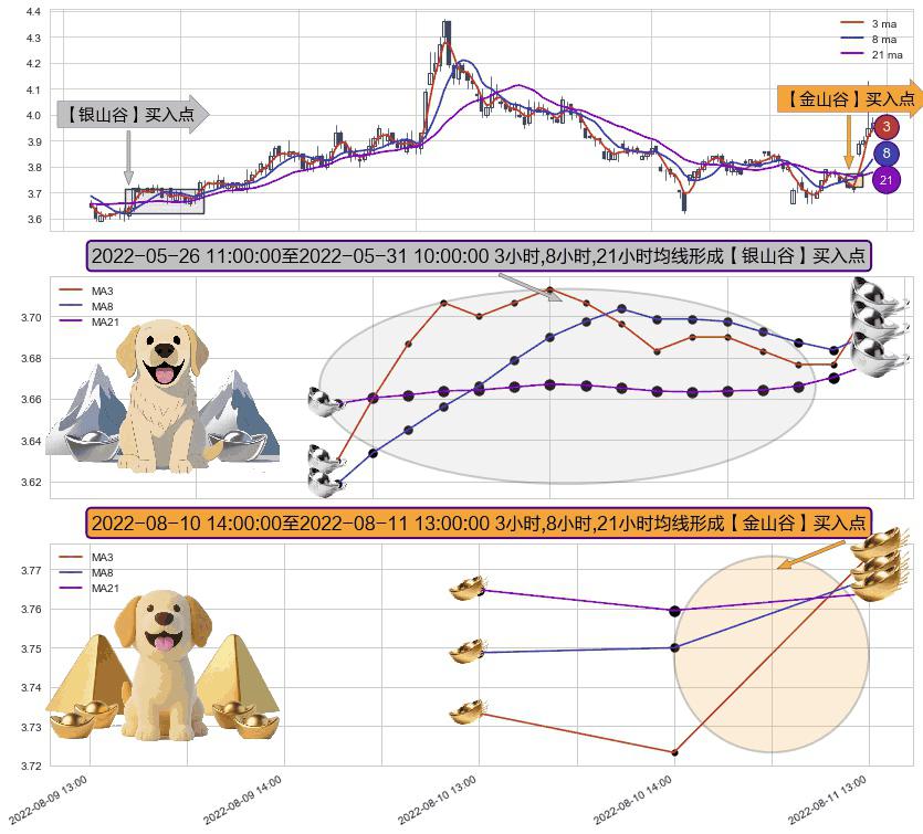 ⚃ 2022-08-11 13:00:00-小时至2022-08-11 13:00:00-小时显现 3小时-8小时-21小时均线 【金山谷】买入点 其再次确认了买入信号,可靠性更强,买入