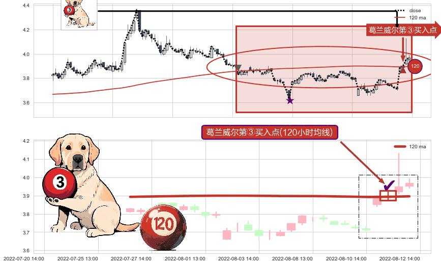 ⚀ 2022-08-11 14:00:00-小时显现 葛兰威尔均线 120小时均线 第③买入点 上升趋势的中继信号,后市看涨,买进信号