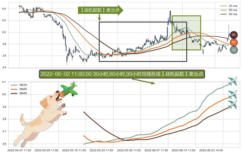 ⚀ 2022-05-16 09:00:00小时-2022-06-28 14:00:00小时显现 30小时-60小时-90小时均线 【战机起航】卖出点 看空信号,后市看跌,卖出