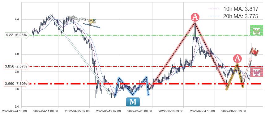 ♘ 支撑价格位3.660,可信任强度99.02%,距离最后交易2022-08-12 14:00形成的收盘价格3.970相差 -7.80%