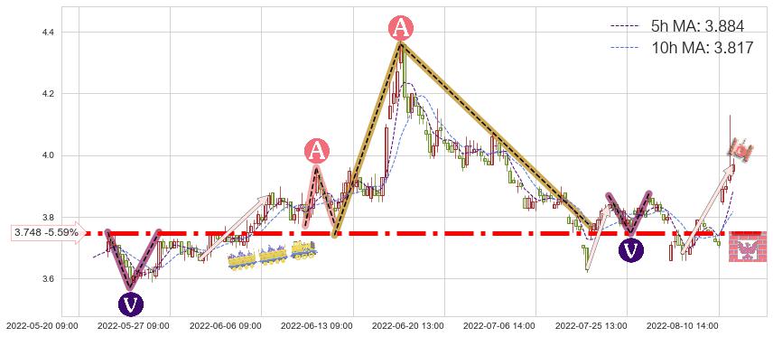 2022-08-10: 第一支撑位3.748起到了持续的支撑作用,有效地促进了价格的回升。