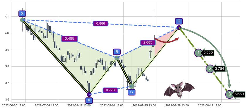 ➣ 未完成【蝙蝠】形态起点X: 06-17:13, 已到达C点: 08-03:14, 预测最终D点: 08-24:13, 共97交易小时