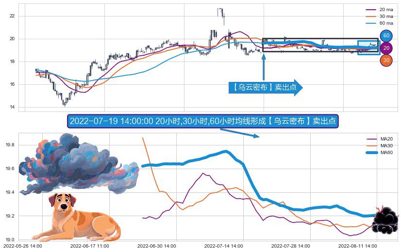 形态多维评估: ⚀ 2022-06-23 14:00:00小时-2022-08-12 13:00:00小时显现 20小时-30小时-60小时均线 【乌云密布】卖出点 看空信号,后市看跌,卖出
