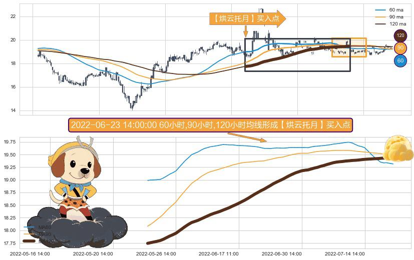 形态多维评估: ⚀ 2022-05-25 09:00:00小时-2022-07-21 13:00:00小时显现 60小时-90小时-120小时均线 【烘云托月】买入点 看多信号,后市看涨,买入