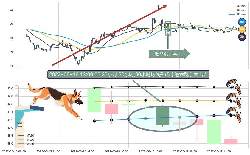 形态多维评估: ⚀ 2022-06-16 13:00:00小时显现 30小时-60小时-90小时均线 【绝命跳】卖出点 看空信号,后市看跌,卖出