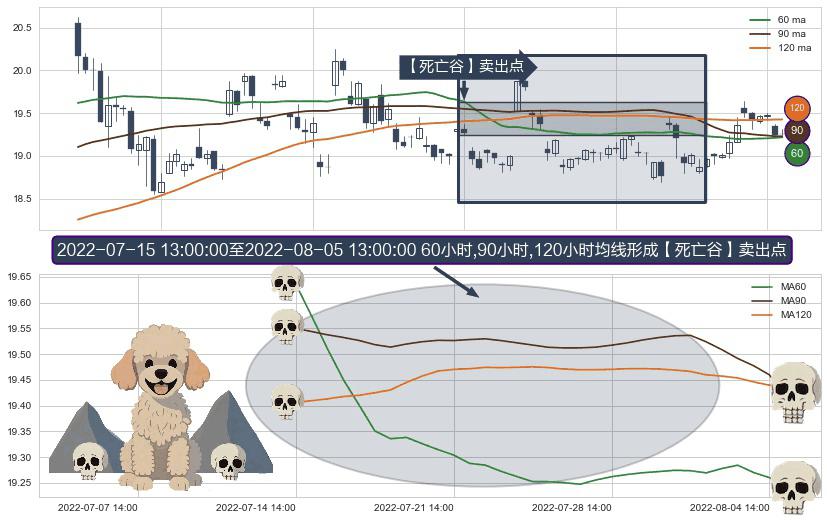 形态多维评估: ⚀ 2022-07-15 14:00:00-小时至2022-08-05 13:00:00-小时显现 60小时-90小时-120小时均线 【死亡谷】卖出点 看空信号,后市看跌,卖出