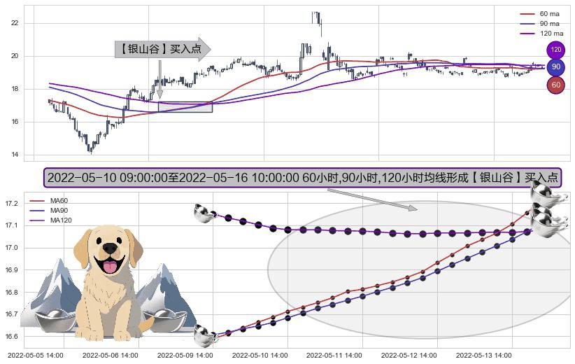 形态多维评估: ⚀ 2022-05-10 10:00:00-小时至2022-05-16 10:00:00-小时显现 60小时-90小时-120小时均线 【银山谷】买入点 看多信号,后市看涨,买入