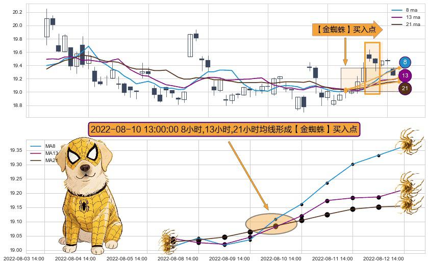 形态多维评估: ⚀ 2022-08-10 13:00:00小时显现 8小时-13小时-21小时均线 【金蜘蛛】买入点 看多信号,后市看涨,买入