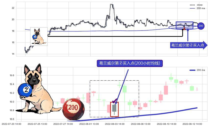形态多维评估: ⚀ 2022-08-02 14:00:00-小时显现 葛兰威尔均线 200小时均线 第②买入点 上升趋势的中继信号,后市看涨,买进信号