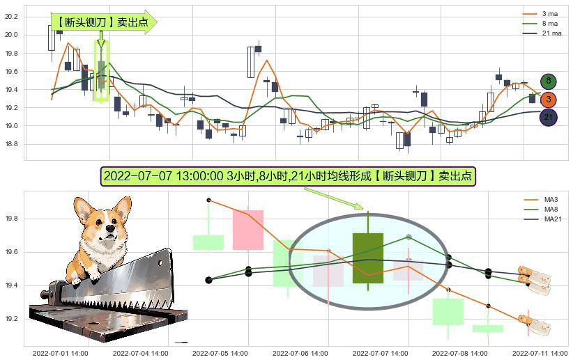 形态多维评估: ⚀ 2022-07-07 13:00:00小时显现 3小时-8小时-21小时均线 【断头铡刀】卖出点 看空信号,后市看跌,卖出