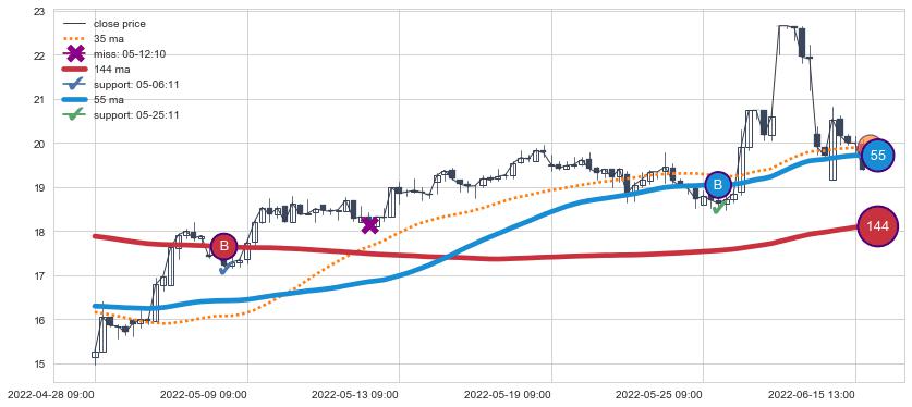 上涨趋势04-28 09:00-06-15 14:00,均线144, 55确认关键支撑2处