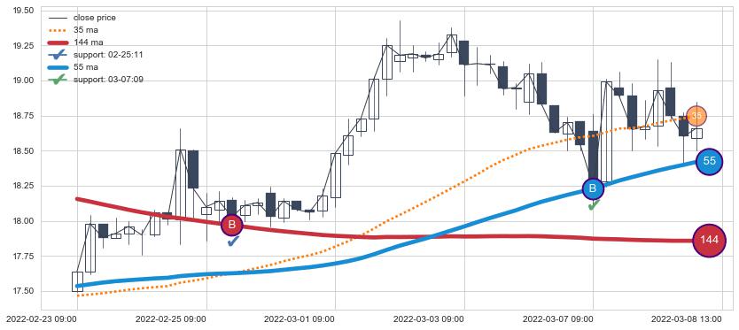 上涨趋势02-23 09:00-03-08 13:00,均线144, 55确认关键支撑2处