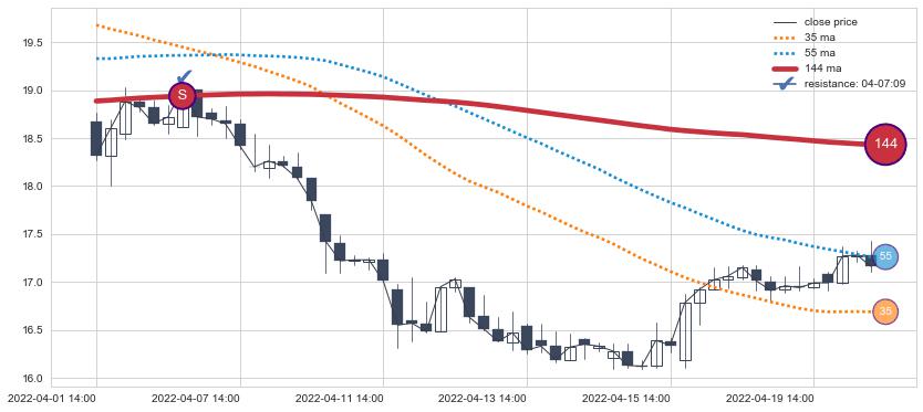 下跌趋势04-01 14:00-04-20 13:00,均线144确认关键阻力1处