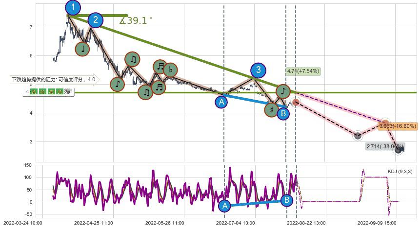 ♘ 阻力价格位4.60,可信任强度64.83%,距离最后交易2022-08-12 14:00形成的收盘价格4.38相差 +4.95%