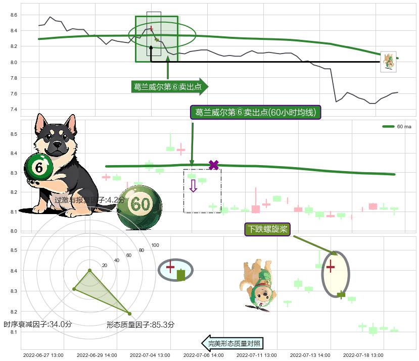 从2022-07-15 13:00至2022-08-12 14:00,共包含42个小时,阶段股价下跌-6.31%,阶段股价变动位移路程比: 1 : 2,2022-08-05 13:00向↘︎形成缺口,跳空下跌-5.31%˚
