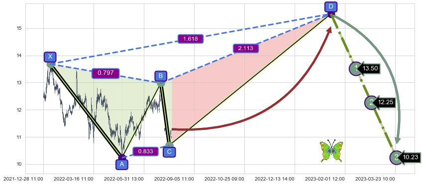 ➣ 未完成【蝴蝶】形态起点X: 01-07:10, 已到达C点: 08-03:14, 预测最终D点: 01-18:13, 共1396交易小时