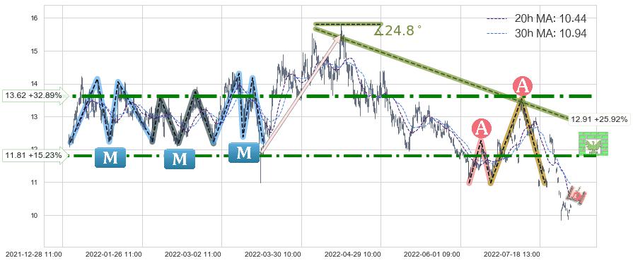 从2022-04-06 14:00至2022-08-12 14:00,共包含322个小时,阶段股价下跌-34.73%,阶段股价变动位移路程比: 1 : 10,下跌趋势角度: 24.8