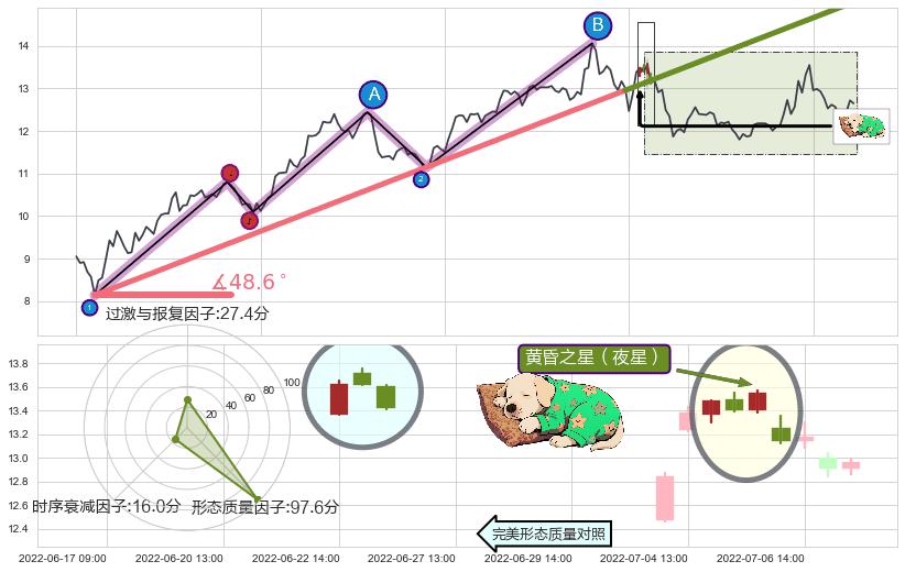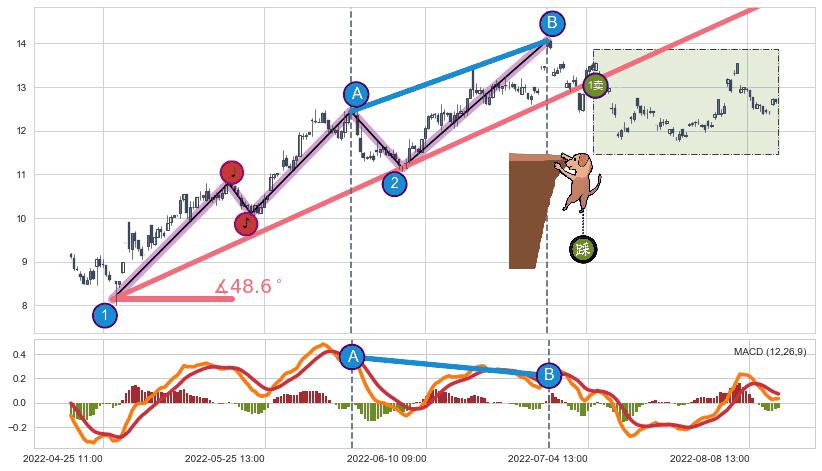 从2022-05-06 09:00至2022-06-30 14:00,共包含145个小时,阶段股价上涨49.14%,阶段股价变动位移路程比: 1 : 3,上涨趋势角度: 48.6