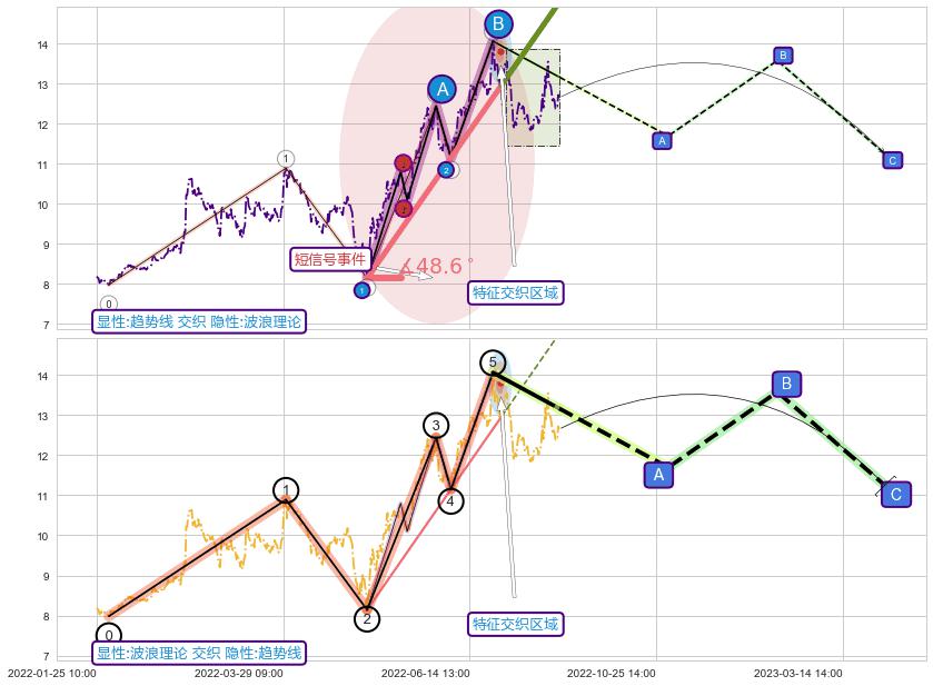从2022-04-12 11:00至2022-05-23 10:00,共包含84个小时,阶段股价上涨16.67%,阶段股价变动位移路程比: 1 : 7