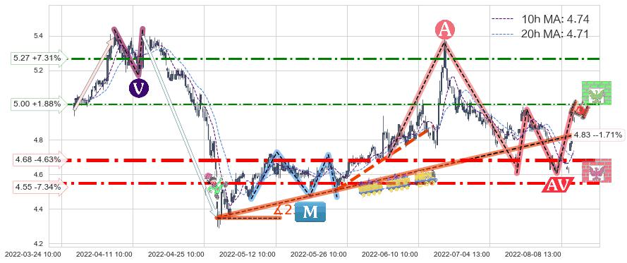 ♘ 支撑价格位4.68,可信任强度91.38%,距离最后交易2022-08-12 14:00形成的收盘价格4.91相差 -4.63%