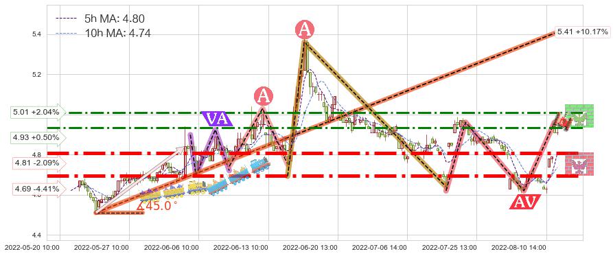 ♘ 阻力价格位4.93,可信任强度60.01%,距离最后交易2022-08-12 14:00形成的收盘价格4.91相差 +0.50%