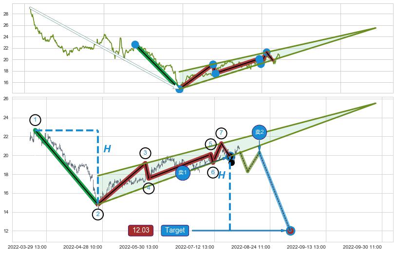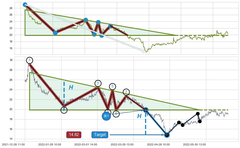 ➢ 最小中继整理跌幅→𝐇: 7.86 (𝐇楔型旗杆的长度:楔型起点→顶点)