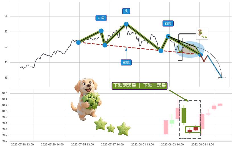 | 2 🅚:看跌(高位倒锤头)流星线 ➕ 📐:头肩顶猜想突破点临近,临近关键支撑位,预期下沉突破下跌 ☞ 看空信号 ⇥ 【🅚线】交织【图形】⇥ 综合量化分数: 43 | > |