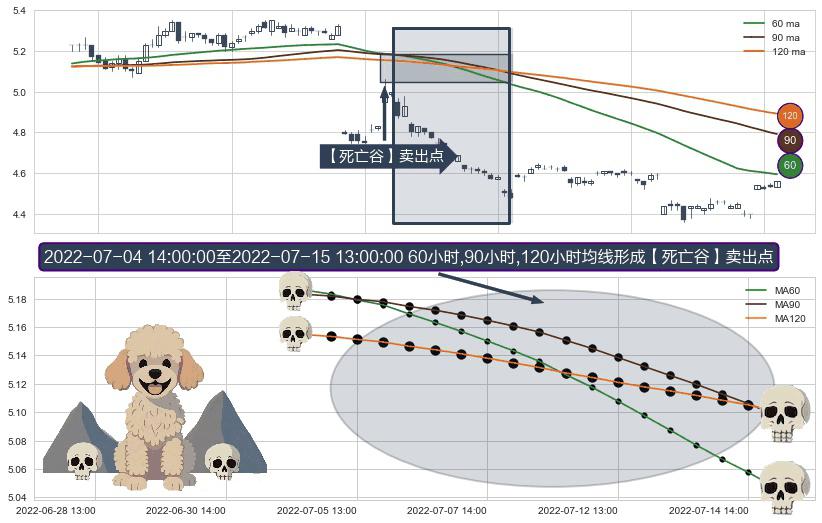 ⚀ 2022-07-05 13:00:00-小时至2022-07-15 13:00:00-小时显现 60小时-90小时-120小时均线 【死亡谷】卖出点 看空信号,后市看跌,卖出