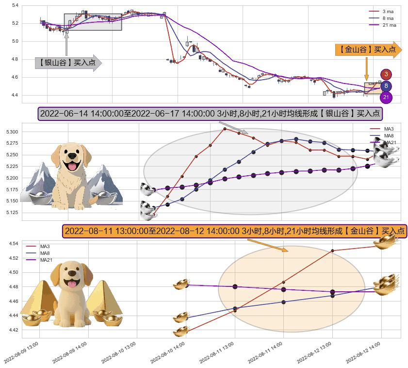 ⚀ 2022-08-11 14:00:00-小时至2022-08-12 14:00:00-小时显现 3小时-8小时-21小时均线 【金山谷】买入点 其再次确认了买入信号,可靠性更强,买入