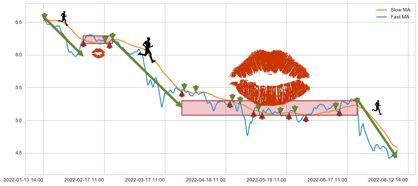 01-13 14:00至02-08 13:00 慢线与快线呈空头排列, 慢线与快线接触少,无缠绕