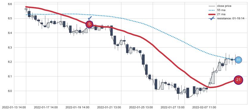 ⚅ 均线向上突破后,2022-06-21 14:00:00-小时价格上探超过 正乖离率超卖第三卖点 :3.1969887732770474后开始止涨下跌再次均线破位