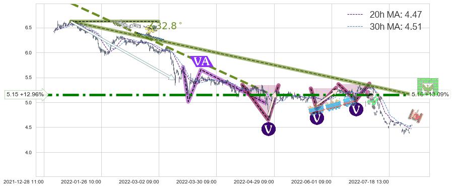 ♘ 在最后的下跌阶段2022-01-11 14:00至2022-08-12 14:00,存在 持续未破位的阻力位 ,阻力价格5.16,可信任强度87.38%,其距离最后价格4.56相差 +13.09%