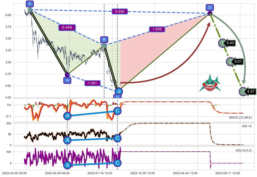 ➣ D点拟合预测价格6.03,距离最后交易收盘价格4.56相差 +32.32%