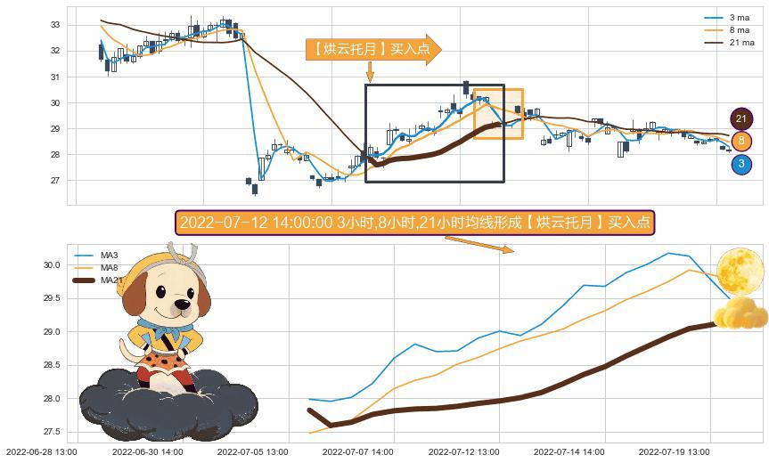 形态多维评估: ⚀ 2022-07-05 14:00:00小时-2022-07-19 14:00:00小时显现 3小时-8小时-21小时均线 【烘云托月】买入点 看多信号,后市看涨,买入
