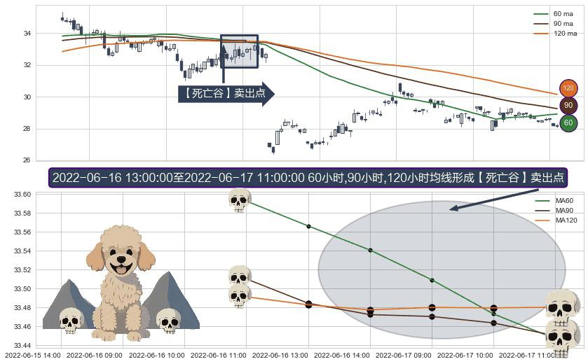 形态多维评估: ⚀ 2022-06-16 14:00:00-小时至2022-06-17 11:00:00-小时显现 60小时-90小时-120小时均线 【死亡谷】卖出点 看空信号,后市看跌,卖出