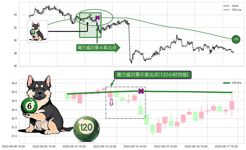形态多维评估: ⚀ 2022-06-13 09:00:00-小时显现 葛兰威尔均线 120小时均线 第⑥卖出点 走势反转见顶信号,后市看跌,卖出信号