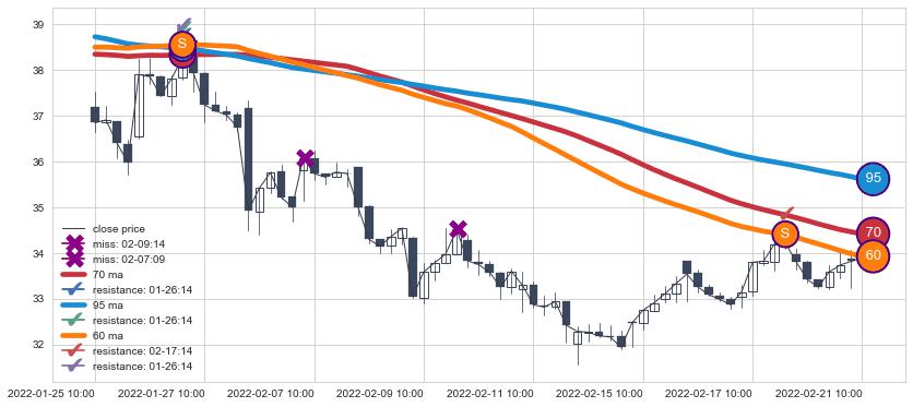 下跌趋势01-25 10:00-02-21 10:00,均线60, 70, 95确认关键阻力2处