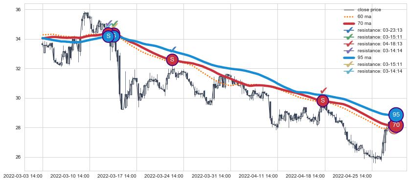 下跌趋势03-03 14:00-04-27 13:00,均线70, 95确认关键阻力4处