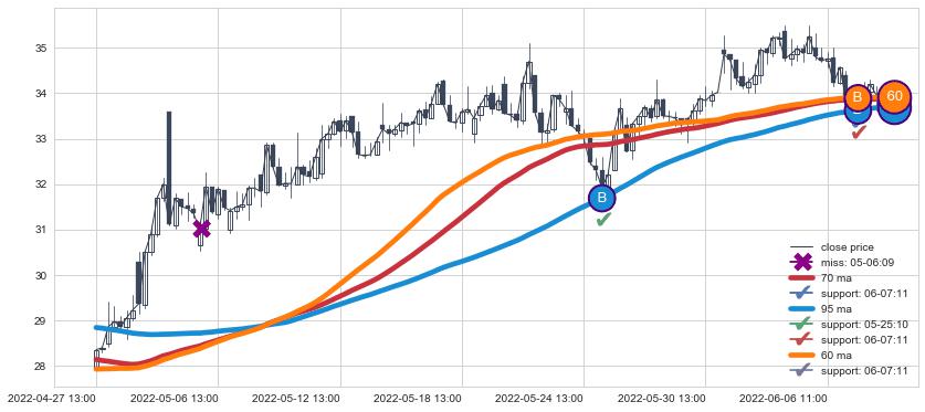 上涨趋势04-27 13:00-06-08 09:00,均线60, 70, 95确认关键支撑2处