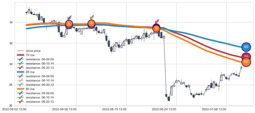 下跌趋势06-02 13:00-07-13 13:00,均线60, 70, 95确认关键阻力3处