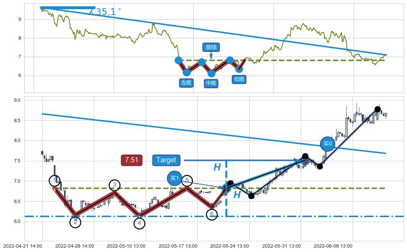 从2022-05-10 09:00至2022-06-28 13:00,共包含153个小时,阶段股价上涨31.45%,阶段股价变动位移路程比: 1 : 4,上涨趋势角度: 47.5