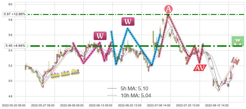 ♘ 阻力价格位5.46,可信任强度95.85%,距离最后交易2022-08-12 14:00形成的收盘价格5.20相差 +4.94%