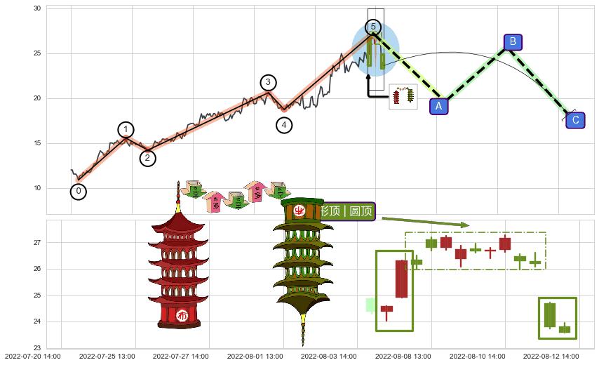 | 5 🅚:吊颈线(上吊线) ➕ 🌊:波浪理论猜想上涨浪5已形成,猜想后续形成回调abc下跌(均值回复) ☞ 看空信号 ⇥ 【🅚线】交织【图形】⇥ 综合量化分数: 49 | > |