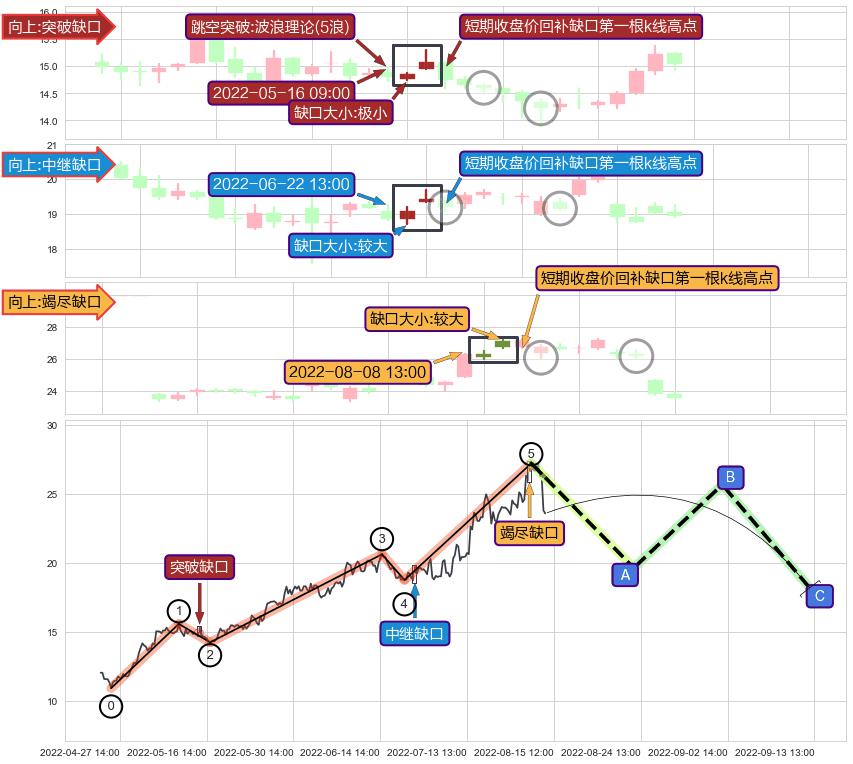 ➢ 突破缺口形成后,后续k已经超过14根,跳空突破波浪理论(5浪)关键点后, 出现【完全回踩】迹象,短期收盘价回补缺口第一根k线高点