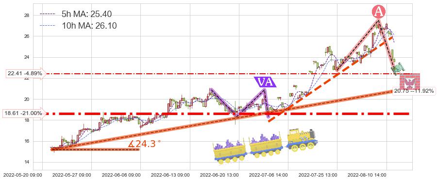 ♘ 在最后的上升阶段2022-05-23 09:00至2022-08-12 13:00存在 持续未破位的支撑位 ,支撑价格20.75,支撑可信任强度88.24%,其距离最后价格23.56相差 -11.92%