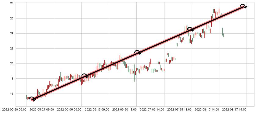 从2022-06-29 14:00至2022-08-12 13:00,共包含64个小时,阶段股价上涨26.42%,阶段股价变动位移路程比: 1 : 4,上涨趋势角度: 43.9