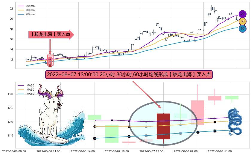 形态多维评估: ⚀ 2022-06-07 13:00:00小时显现 20小时-30小时-60小时均线 【蛟龙出海】买入点 看多信号,后市看涨,买入