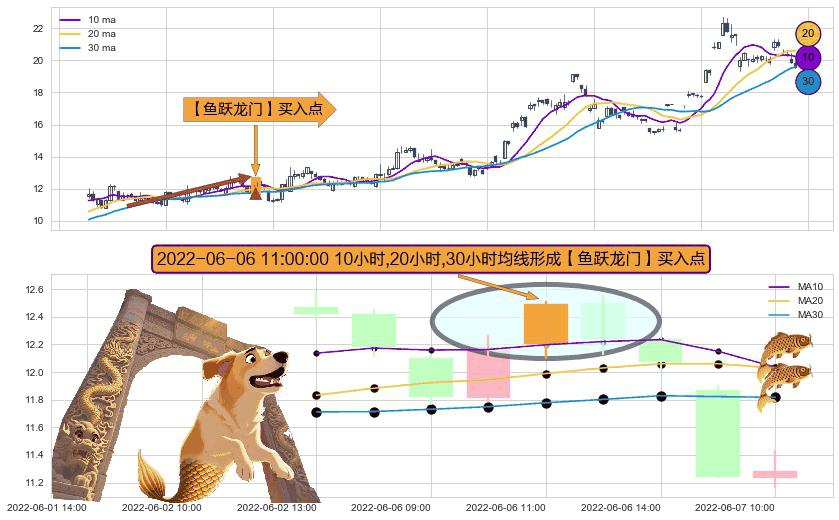 形态多维评估: ⚀ 2022-06-06 11:00:00小时显现 10小时-20小时-30小时均线 【鱼跃龙门】买入点 看多信号,后市看涨,买入