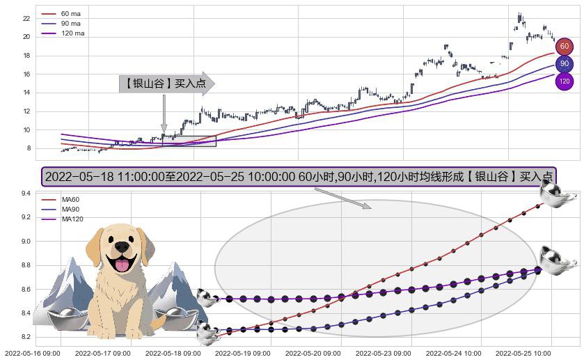 形态多维评估: ⚀ 2022-05-18 13:00:00-小时至2022-05-25 10:00:00-小时显现 60小时-90小时-120小时均线 【银山谷】买入点 看多信号,后市看涨,买入